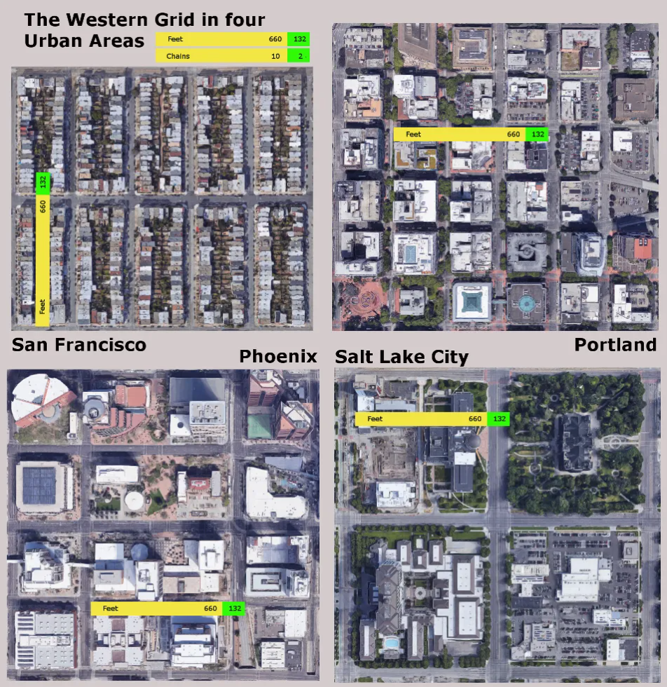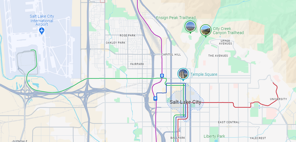 Something that immediately sticks out about SLC is their ginormous block sizes, which make you feel like all of a sudden you have shrunk! The below diagram is an illustrative way of seeing how four major cities lay out their blocks. Th seemingly simple decision of “block size” is an underrated factor in shaping a city’s culture. Interestingly, many block dimensions are divisible by 66 ft, since this was the length of a popular surveying tool dating back to the 15th century. In addition to the huge block sizes, the city layout is very organized, with streets running directly in the East/West and North/South directions. The street names also follow a convention based on how far south or west they are from Temple Square, the place where the original pioneers deemed the epicenter of SLC. Most of the organizational decisions for the layout of SLC can be traced back to Joseph Smith’s “Plat of the City Zion” structure. The large block sizes give the city an open, uncramped feel, which is also probably due to the relatively low density of the city (population 204,000, 110 mi^2). So, in addition to it’s usual helpful use cases, satellite imagery of SLC can also serve as grid paper if you’re in a pinch!