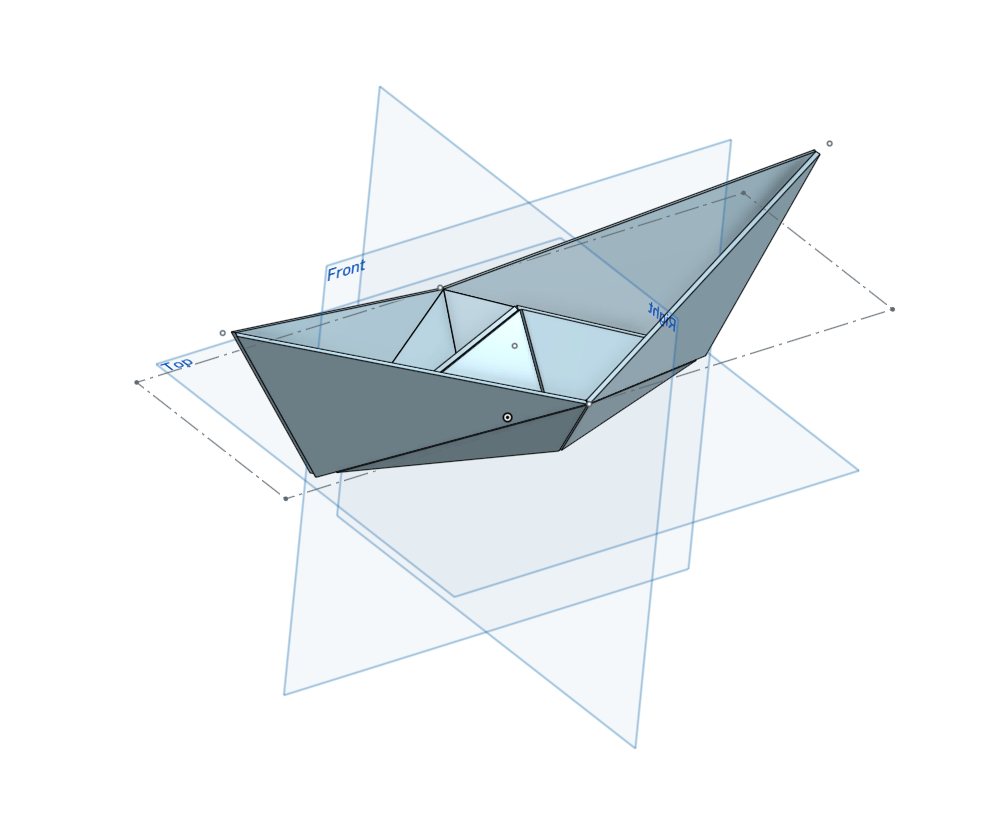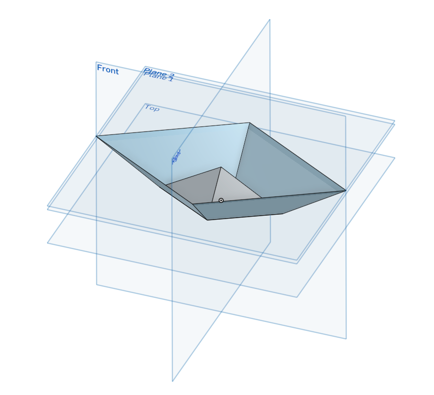 Since I hadn’t found exactly the model to use, I turned to CAD. If ski skills were measured in the same way to CAD competency, then my level would be solidly on the bunny slopes, probably a kid being pulled on a waist leash. I used Onshape online to build the origami model of the boat. After folding a paper boat to use as a model, I noticed you could make a very cheatsy model by extruding a diamond to point from bottom to top, and overlap extruding a diamond to small diamond top to bottom, and then removing the bottom shell. Unfortunatly, CAD, like jokes, can suffer from explination, so here’s a picture.